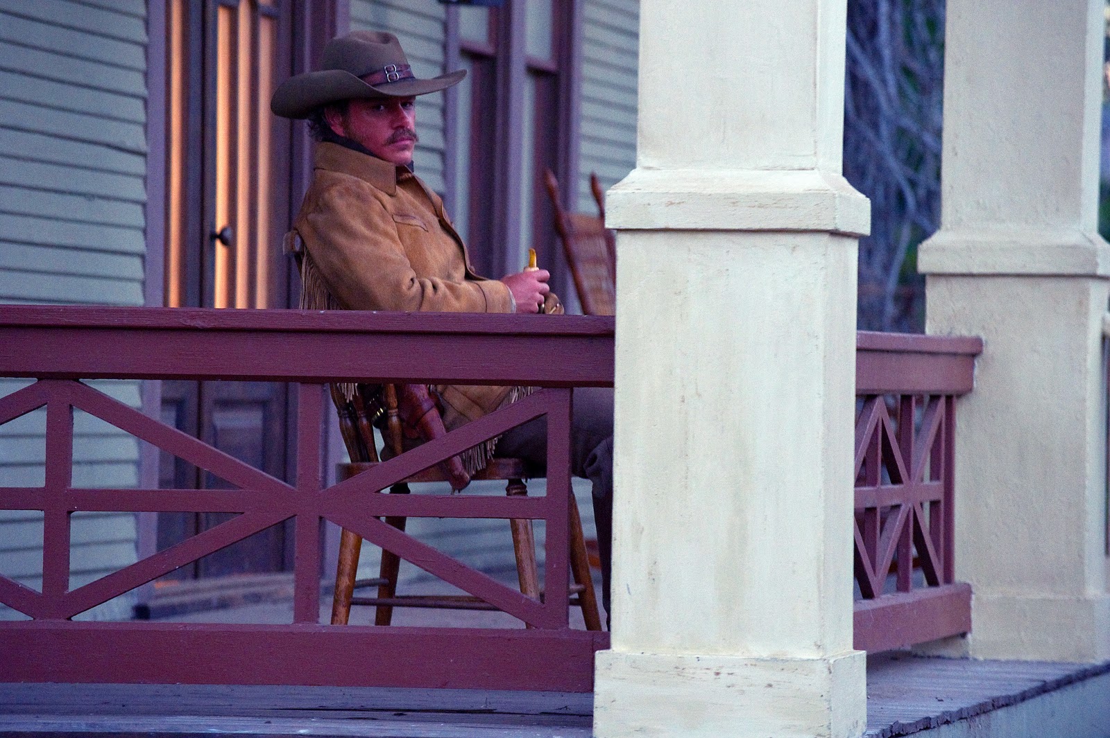 When Steinfeld's Mattie first meets the handsome LaBoeuf, there is the mystique about him that might impress a young girl beginning to deal with the confusing feelings of emergent sexuality; he sits on a porch rocking back as he menacingly smokes a pipe, his spurs glistening in the light of dusk. The protective (and much older) Cogburn, dangerous as he is, provides a less threatening alternative, filling the vacancy left by her father. Perhaps it is her benign recollection of him which burnishes his questionable reputation. Or perhaps it is the solidarity forged by the strange digressions I mentioned earlier, interludes which she alone shares with Cogburn while LaBoeuf is elsewhere: an eerie encounter with a hanging corpse; a run-in with a mysterious trapper. (Although there is no embellishment, at least not a positive one, of Cogburn's feelings towards two Indian kids). And the film elides over the injured LaBoeuf's final fate after he helps raise the snakebit Mattie into Cogburn's arms so the marshal can rush her to safety. He lives in the Portis book and dies in the Hathaway film. Here, he is simply forgotten.