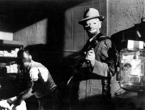 Clay: Alright, sister. That’s a mighty pretty head you got on your shoulders. You wanna keep it there or start carrying it around in your hands?Notably, the second time is with a hired gun played by the deranged-looking Timothy Carey. Carey’s hitman, Nikki Arane, is hired by Clay to shoot Red Lightning, the horse widely expected to be the frontrunner of the seventh race, the $100,000 Added Lansdowne Stakes. When Arane—a sniper used to eliminating people—gets to nosy about assassinating a horse, Clay’s initial response is to speedily inform him that he’s also getting paid not to ask questions. Clay only slows down when he realizes Arane has noticed this nervous tic, allaying his own fears more than Arane’s when he jokes, “You’d be killing a horse. That’s not first degree murder. In fact, it’s not murder at all. In fact, I don’t know what it is.”