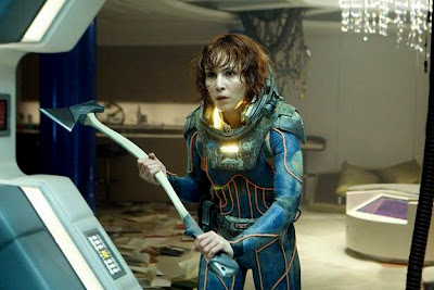 Even though Rapace is Prometheus's actual lead, after just seeing Theron in another film only two days ago I am taken with her subtlety in playing one of the corporate stooges that have become as much a staple of the Alien film series as its androids have. Vickers is insensitive enough and calculating enough that the Prometheus's captain, Janek (Idris Elba) asks her if she, too, is a robot. But she has enough of a concern for life that she resides in a continuum somewhere between the bloodless David and the beatific Shaw. The only question is whether Vickers is interested in preserving all of her employees' lives or just her own. For a while, and due largely to Theron's complex performance, you'll wonder if she is the unlikely person who will emerge as the story's hero.