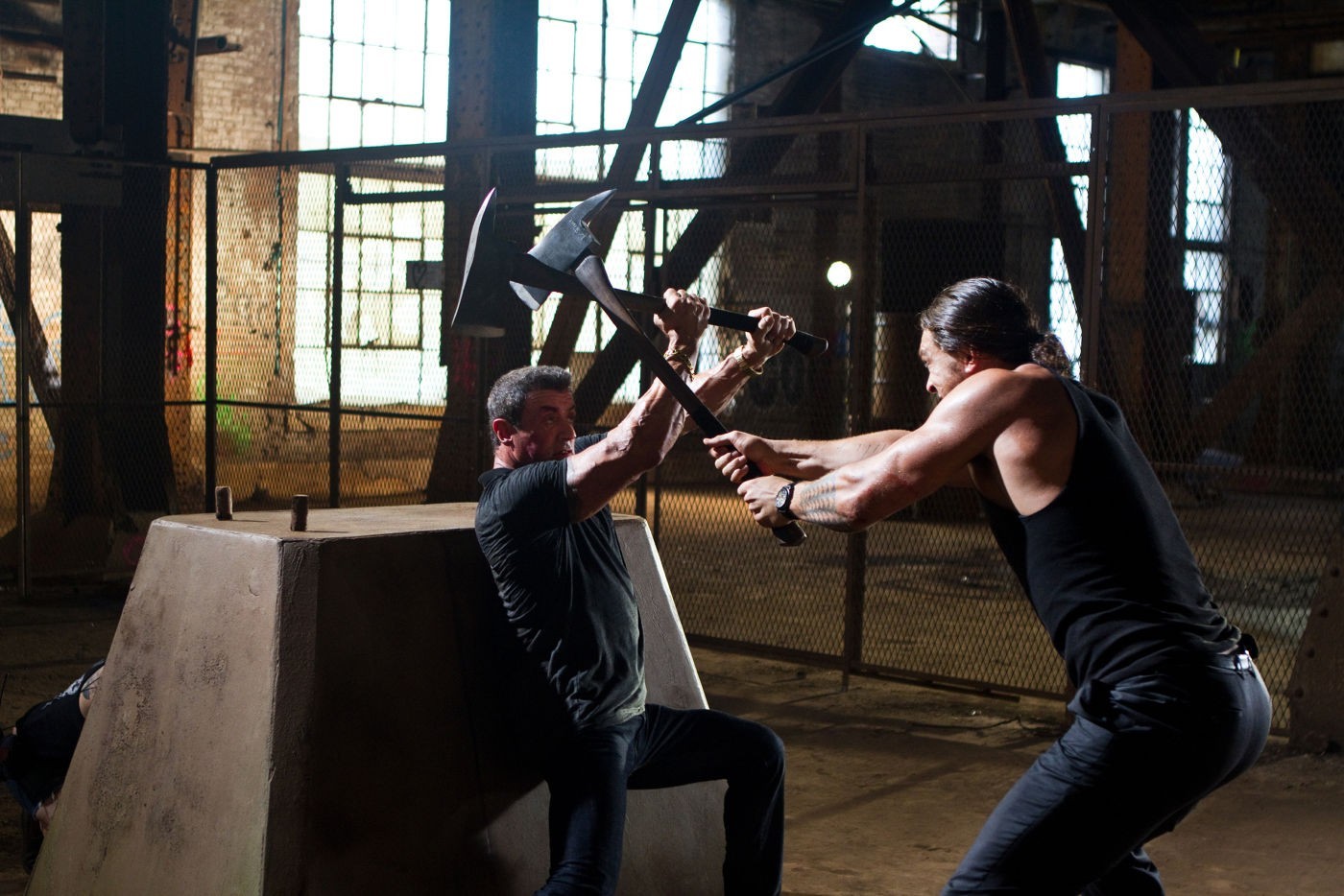 Fortunately, the supporting cast is rounded out by interesting TV faces who each sport their own appealing quirks. Adewale Akinnuoye-Agbaje (Lost) is Bullet to the Head's hulking villain, a canny capitalist frustrated by his dependency on henchmen of limited vision due to his own physical disabilities. Brian Van Holt (Cougar Town) brings his loose cowboy charm to his extended cameo as the guy who brokered the film's inciting contract kill. The gorgeous Sarah Shahi (Fairly Legal) and Weronika Rosati (Luck) offer the requisite gratuitous nudity as the movie's damsels in distress—Bobo's daughter Lisa and a prostitute whose life Bobo spares, respectively. Game of Thrones' Jason Momoa takes pole position as the brute who killed Bobo's friend, taking advantage of his spotlight with a climactic axe-fight set-piece brilliantly staged by Hill.
