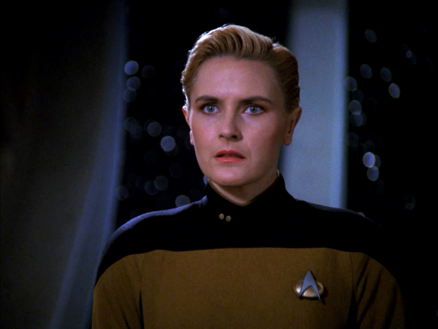 Most emblematic of the third season and its staff's ability to turn the tumultuous atmosphere offscreen into great drama onscreen was "Yesterday's Enterprise." A series standout, this episode started out as two separate scripts, a feature-length submission from production assistant Eric Stillwell and a spec screenplay from Trent Christopher Ganino. Together, the new story contained familiar elements from the original 60s show—Sarek (Mark Lenard), Harlan Ellison's Guardian of Forever—fused with new elements like the reappearance of the late security chief Tasha Yar (Denise Crosby). The entire staff took a crack at reworking the episode into something inexpensive to produce yet powerful. They succeeded. "Yesterday Enterprise" depicts a timeline altered by the emergence of a 20-year-old Enterprise from a temporal rift. Because of the ship's disappearance in the past the Federation was plunged into a decades-long war with the Klingons. Yar is still alive and in the position normally occupied by the Klingon security officer Worf (Michael Dorn), now absent. But the Enterprise's clairvoyant barkeep, Guinan (Whoopi Goldberg), senses something is off, and presses Picard to send the other Enterprise back to certain destruction in the past in order to restore their present timeline. Dark and downbeat, "Yesterday's Enterprise" is a strong influence on the new, altered Star Trek chronology in J.J. Abrams' current iteration of the franchise. And the episode was the first of a winning streak of episodes that would lead up to the powerful Borg cliffhanger reviewed here last week.